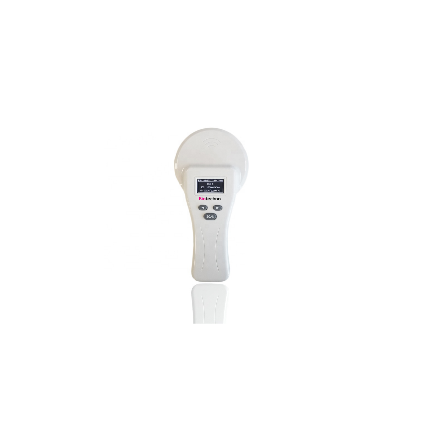 Lector RFID portátil de alta precisión para animales de Biotechno, ideal para clínicas veterinarias, inspecciones y verificación de microchips. Compatible con etiquetas FDX-B, FDX-A y HDX (ISO11784/85), lectura rápida (<100ms) y almacenamiento de hasta 20.000 registros. Pantalla OLED de alto brillo, batería recargable de larga duración y conectividad USB/Bluetooth.